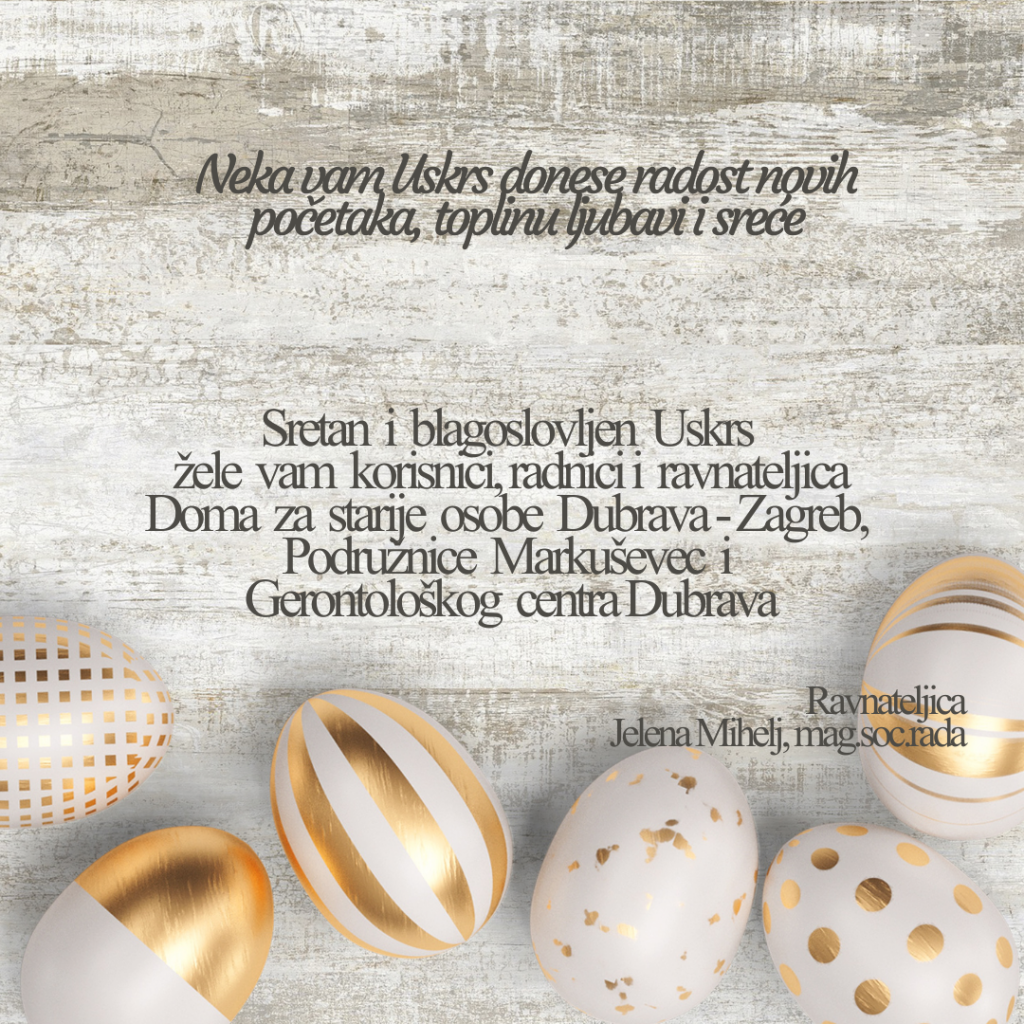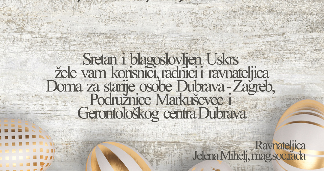 Sretan i blagoslovljen Uskrs žele vam korisnici, radnici i ravnateljica Doma za starije osobe Dubrava-Zagreb, Gerontološkog centra i Podružnice Markuševec.